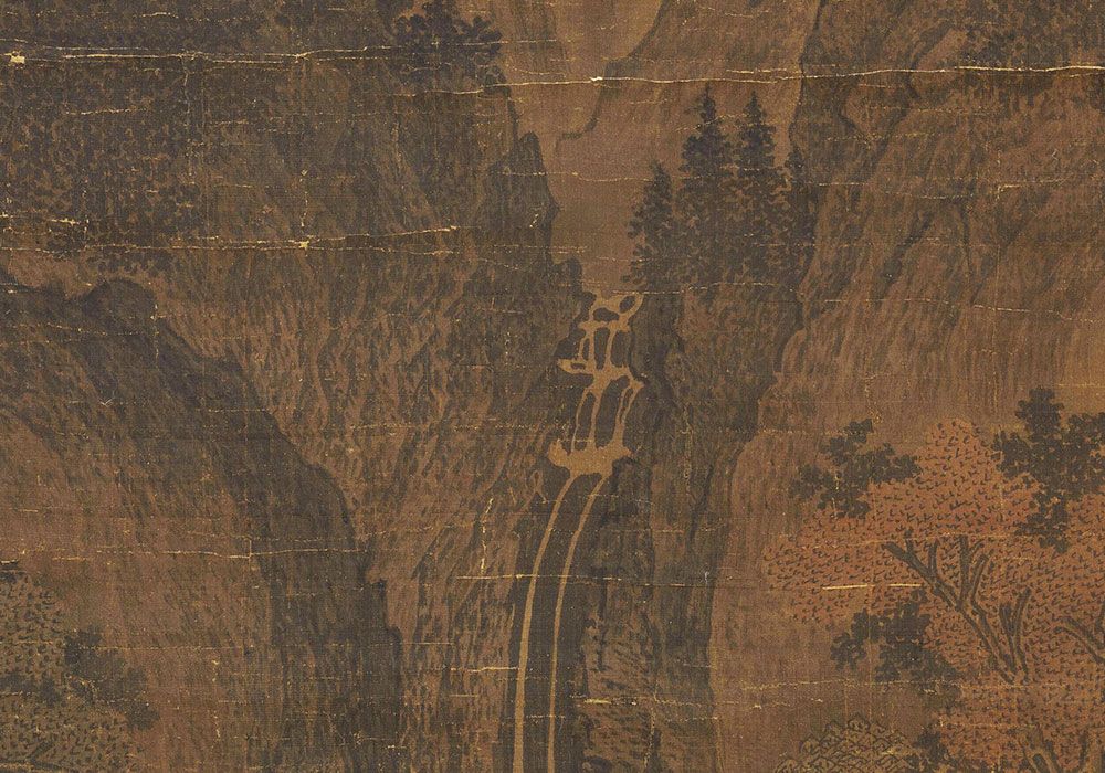 Technically, Guan Tong moved away from the decorative tendencies of the Tang Dynasty to focus on raw texture. He utilized the "Nail-head" stroke, a technique that creates short, forceful indentations on the silk to mimic wind-worn granite. These strokes give the mountain a physical weight and a "bone-like" structure that feels permanent and unyielding.