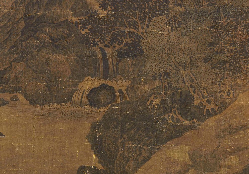 The composition of the painting is a breathtaking example of the "High Distance" (Gaoyuan) technique. The viewer’s eye is led from the turbulent mountain stream at the base, past jagged, wind-scoured boulders, up toward a central peak that rises like a titan into the heavens. Within the misty folds of the mountains, Guan Tong hidden subtle narratives of human life: a secluded temple nestled in a ravine and, most poignantly, a group of travelers and their pack mules waiting at the water’s edge for a ferry. This contrast—the fleeting, anxious waiting of man against the eternal, unmoving majesty of the mountains—embodies the Taoist philosophy of the harmony between the minute and the infinite.