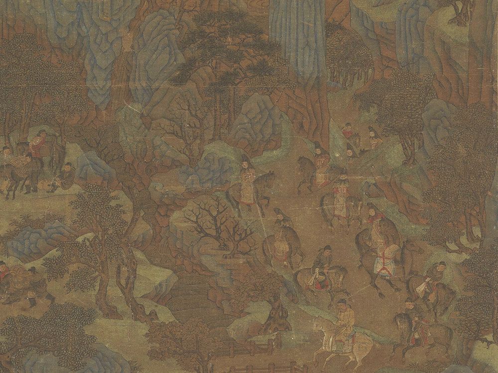 The road to Shu (modern-day Sichuan) has been a subject of awe and trepidation for Chinese poets and painters for centuries. Li Zhaodao’s "Travelers in the Spring Mountains" captures the daunting beauty of this terrain. With its vertical peaks and winding paths, the painting illustrates the "Difficulty of the Shu Road" famously described by the poet Li Bai.